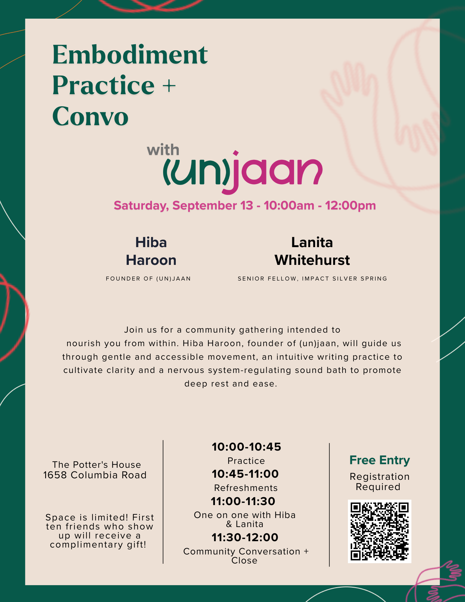 Join us for a community gathering intended to nourish you from within. Hiba Haroon, founder of (un)jaan, will guide us through gentle and accessible movement, an intuitive writing practice, and a nervous system-regulating sound bath to cultivate grounding and ease.