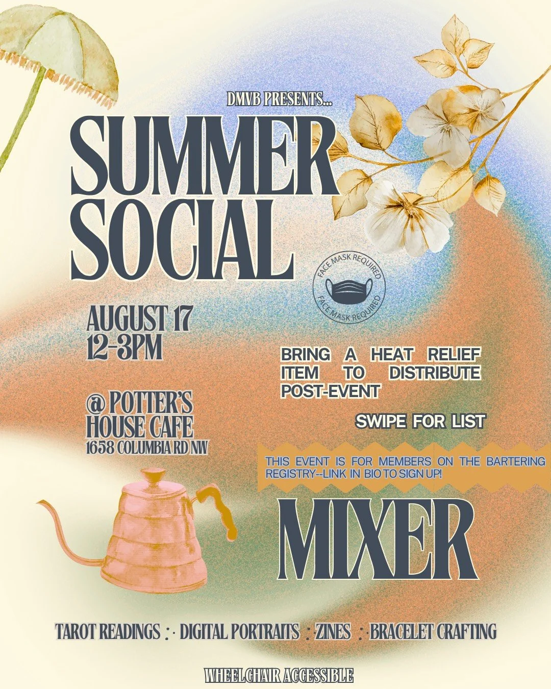 Clear your calendar—- on Sun Aug 17th, DMVBarters will be hosting their Summer Social Mixer! Mingle, make charm bracelets, get a tarot reading, and more at The Potter’s House from 12-3pm. Food and drink will be available for purchase at the cafe.